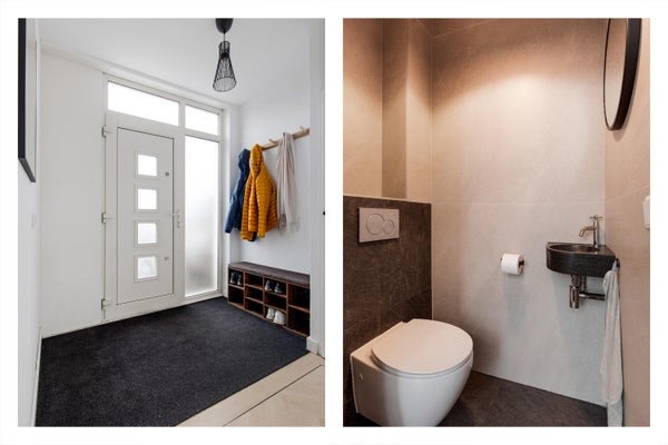 Entree, hal met meterkast en separaat modern toilet met fonteintje.
