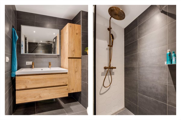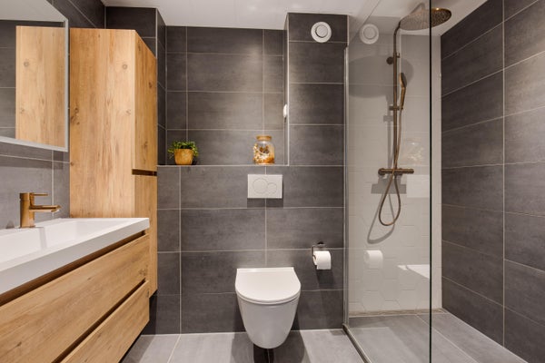 Moderne badkamer (2022) voorzien van inloopdouche, wastafelmeubel en zwevend toilet.