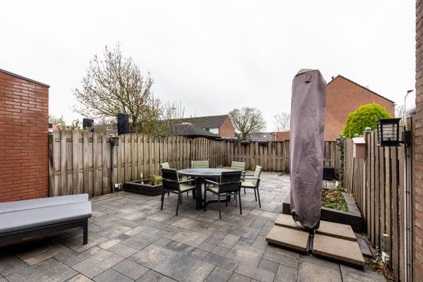 Zeer zonnige en diepe achtertuin op het zuiden. De tuin beschikt over een elektrisch zonnescherm (doek dient vervangen te worden) en achterom.