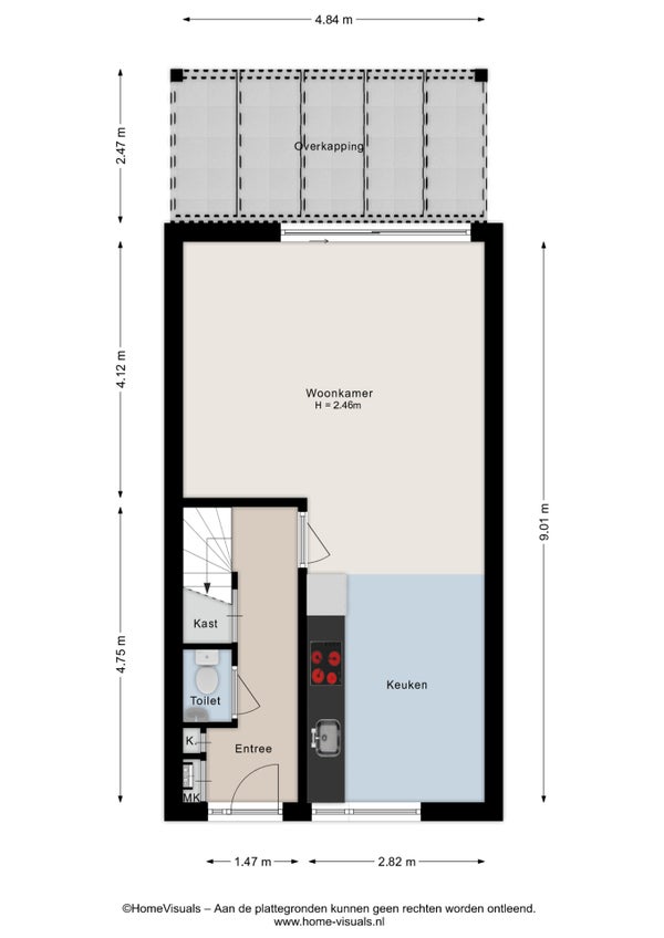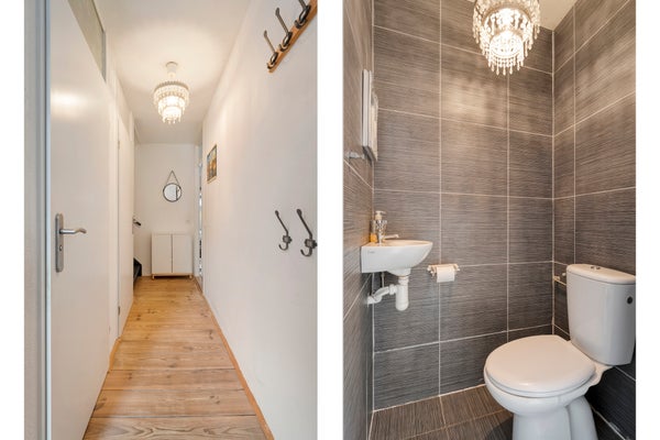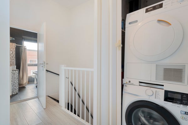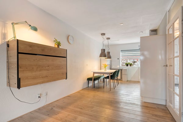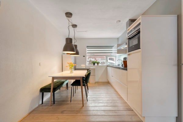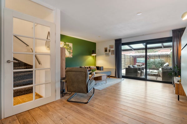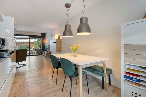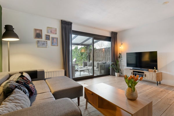 Bij binnenkomst in de hal ontdekt u een praktische trapkast en toegang tot de toiletruimte. De keuken, gelegen aan de straatzijde, is van alle gemakken voorzien. De tuingerichte woonkamer met houten vloer en schuifpui biedt toegang tot de overkapping en tuin.