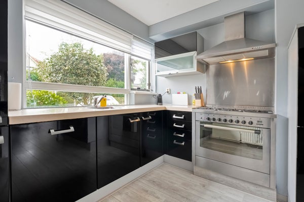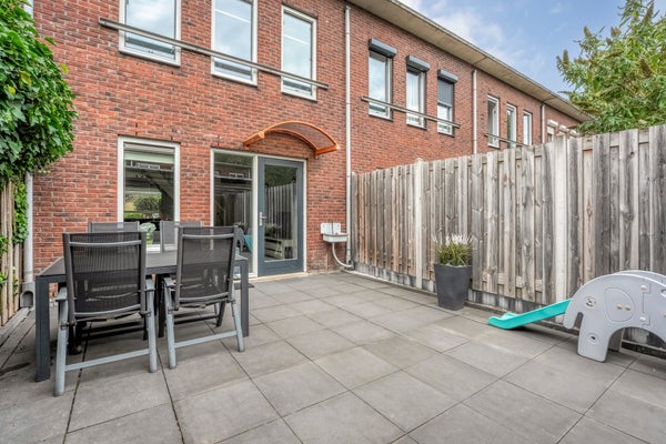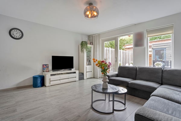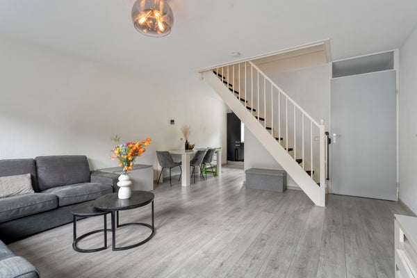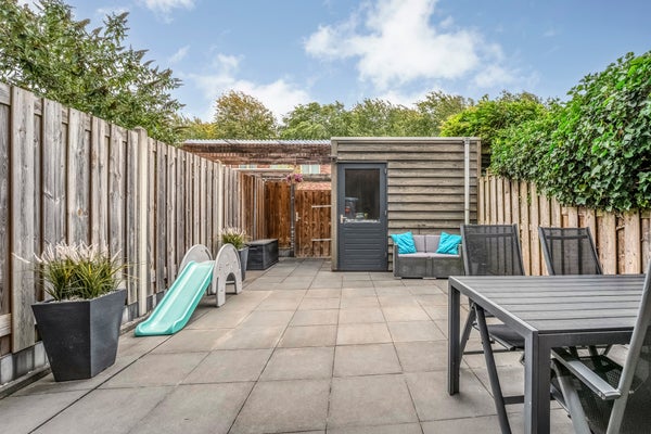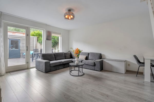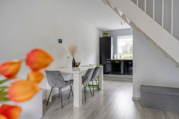 De woning heeft een hal met een moderne toiletruimte. De lichte woonkamer heeft een open indeling en toegang tot de tuin, terwijl de open keuken van diverse inbouwapparatuur is voorzien. Op de eerste verdieping zijn drie slaapkamers en een luxe badkamer, vernieuwd in 2019, met een ruime douche en een wastafelmeubel. Buiten is er een fijne tuin en een berging voor extra opslag.