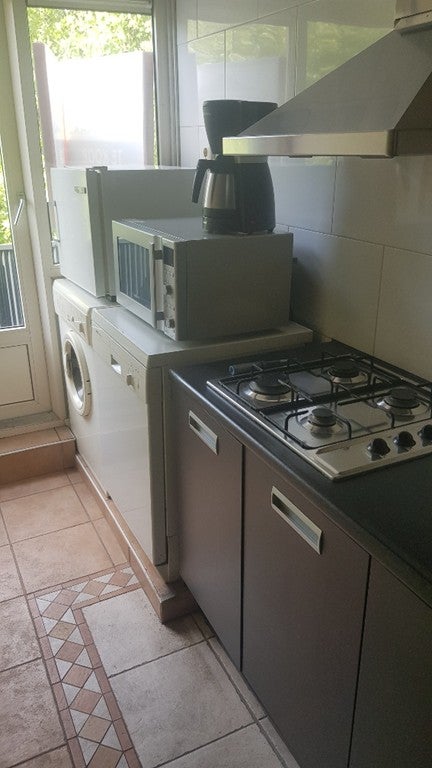 De keuken is voorzien van een koelkast, gaskookstel, wasmachine Het toilet en de badkamer zijn van elkaar gescheiden.