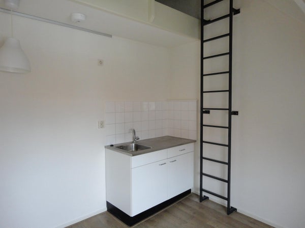 Deze kamer bevindt zich op de tweede etage aan de voorzijde van het pand. De oppervlakte van de kamer bedraagt bijna 12m2 en is voorzien van een eigen keukenblok, spoelbak, ruime opbergruimte en een hoogslaper / vide. Keuken en badkamers (2) worden gedeeld met huisgenoten, evenals het dakterras (12m2).