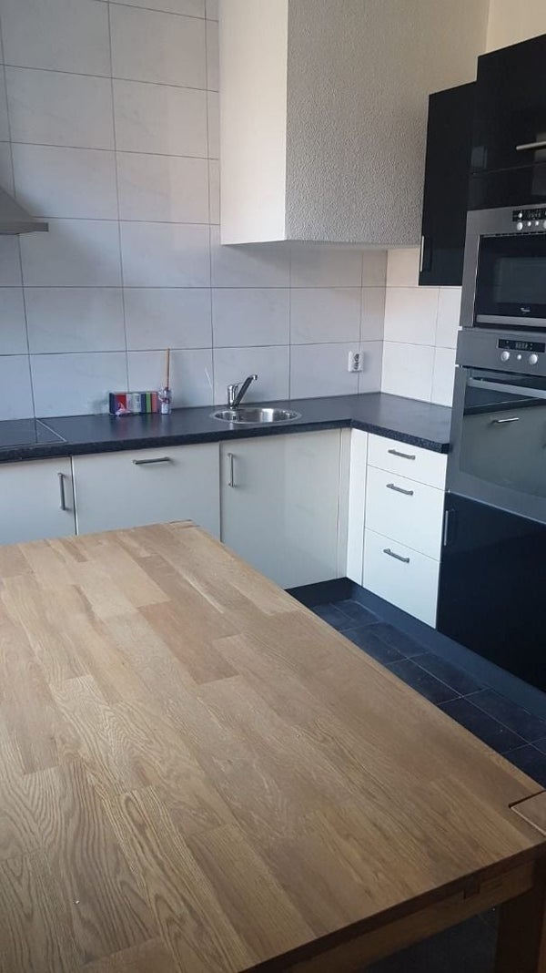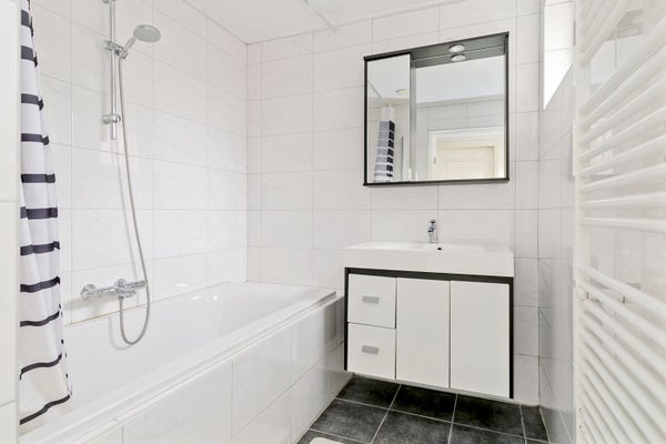 Woonkamer met open keuken. De luxe keuken is uitgerust met inbouwapparatuur (elektrische kookplaat, afzuigkap, vaatwasser, koel-vriescombi). Badkamer met inloopdouche, wastafel en spiegelkast. Opstelplaats voor wasmachine/droger.