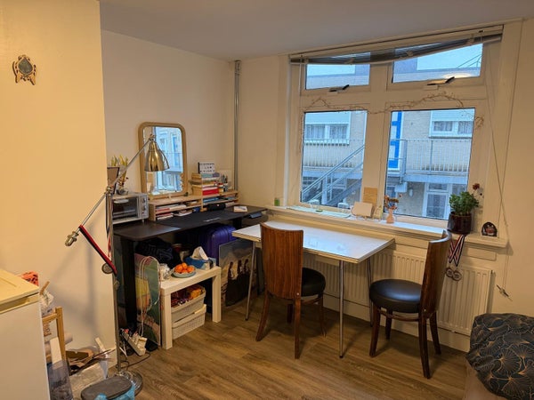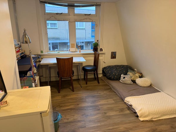 De kamer is +/- 16 m2 groot en je deelt de keuken, toilet en badkamer met 4 mede studenten.
