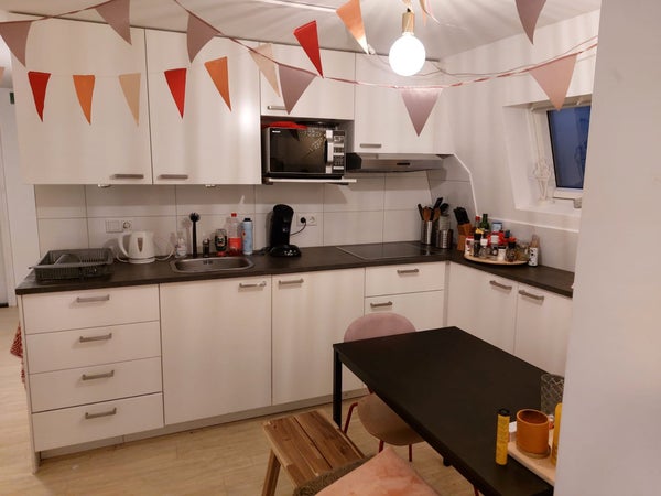Keuken beschikt over een koelkast, afzuigkap en koken op elektra. Tevens is er een wasmachine aanwezig.
