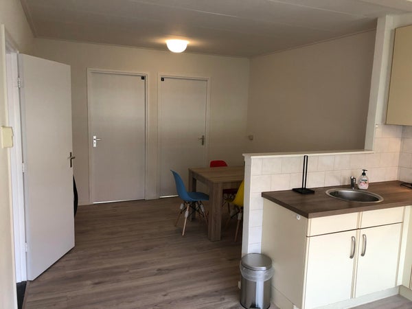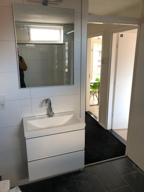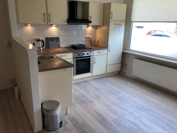 Kamer op de begane grond. Woonkamer met open keuken. De keuken is uitgerust met inbouwapparatuur (elektrische kookplaat, afzuigkap, vaatwasser, koel-vriescombi). Badkamer met douche, wastafel en spiegelkast. Opstelplaats voor wasmachine/droger.