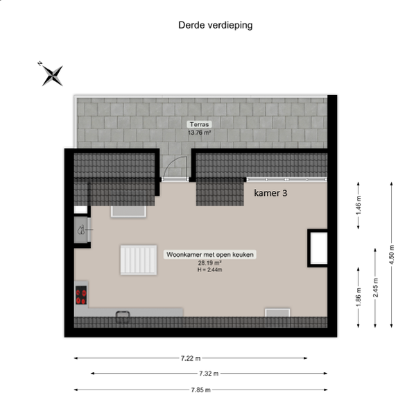 Heeft een oppervlakte van circa 28 m² en beschikt daarnaast over een eigen dakterras van circa 13 m².