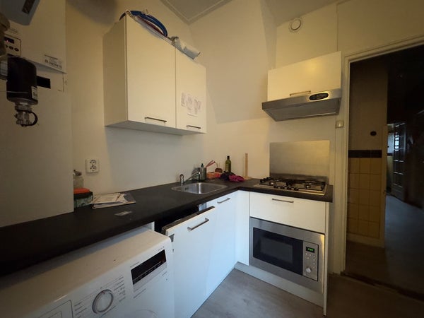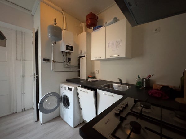 Via de hal krijg je toegang tot alle kamers en de verschillende gemeenschappelijke ruimtes. De kamer bevindt zich aan de achterzijde van het pand. Op de begane grond is een keuken aanwezig, voorzien van alle gemakken, zoals een gaskookplaat, combi-oven/magnetron, koelkast en vaatwasser. Daarnaast is er een gezamenlijke badkamer en een apart toilet. De woning wordt gedeeld met twee mannelijke medebewoners.