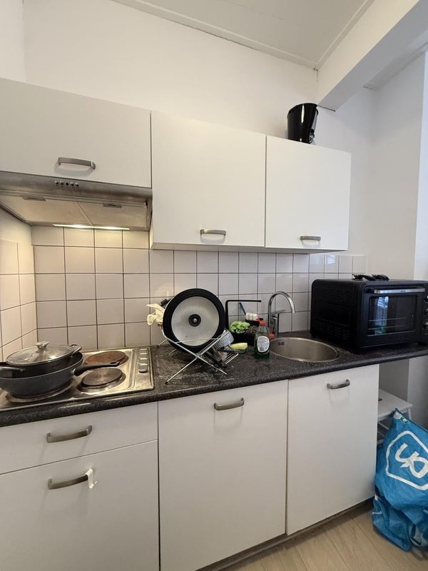 De studio beschikt over een lichte en ruime woonruimte met open keuken. De keuken is voorzien van inbouwapparatuur, waaronder een koelkast, kookplaat, afzuigkap en voldoende kastruimte.
