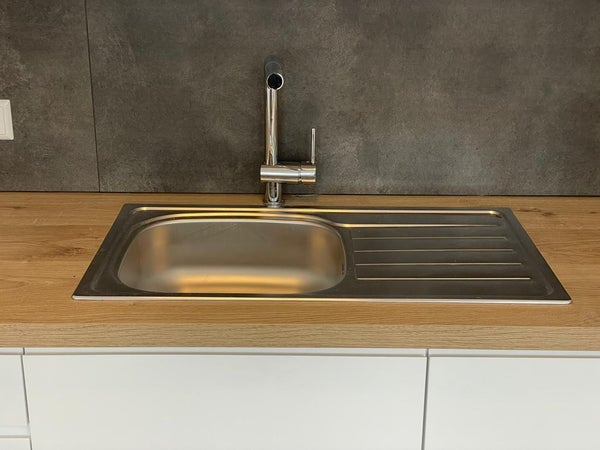 Moderne keuken uitgerust met: vaatwasser, kookplaat met afzuigkap, oven, koelkast en vriezer