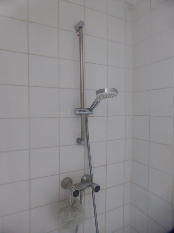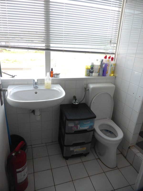 De badkamer met douche en toilet wordt gedeeld met meerdere bewoners.