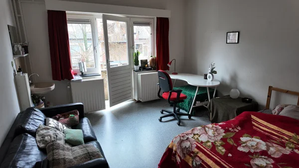 Kamer 2 met eigen wastafel en balkon gelegen op de tweede etage voor met een gemeenschappelijke keuken, toilet, badkamer en kelder met wasmachineruimte. Met buurpand wordt voortuin en fietsenkelder gedeeld.