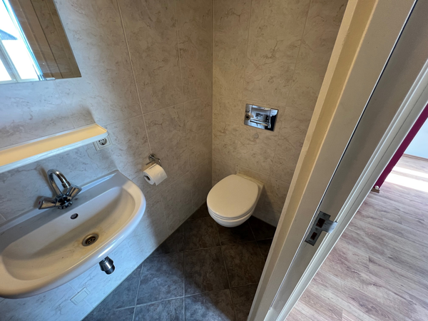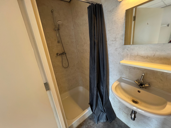 Studio met eigen badkamer (v.v. douche, toilet en vaste wastafel) en gemeenschappelijk gebruik van keuken, buitenruimte en fietsenstalling.