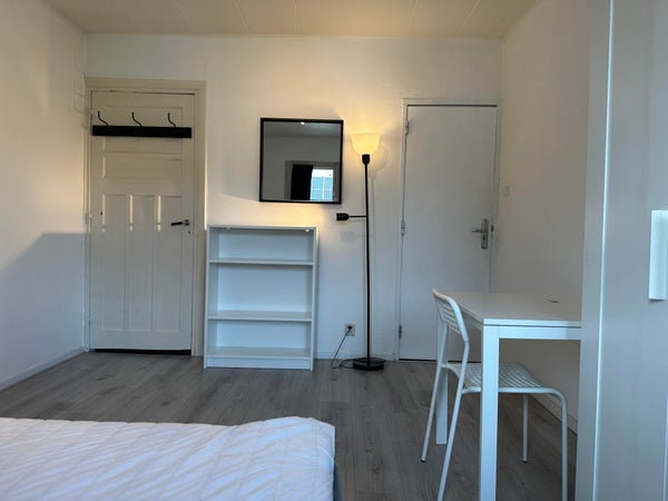 De kamer is 13,4 m2 groot, gemeubileerd met een tweepersoonsbed + matras, kledingkast en tafel met stoel.