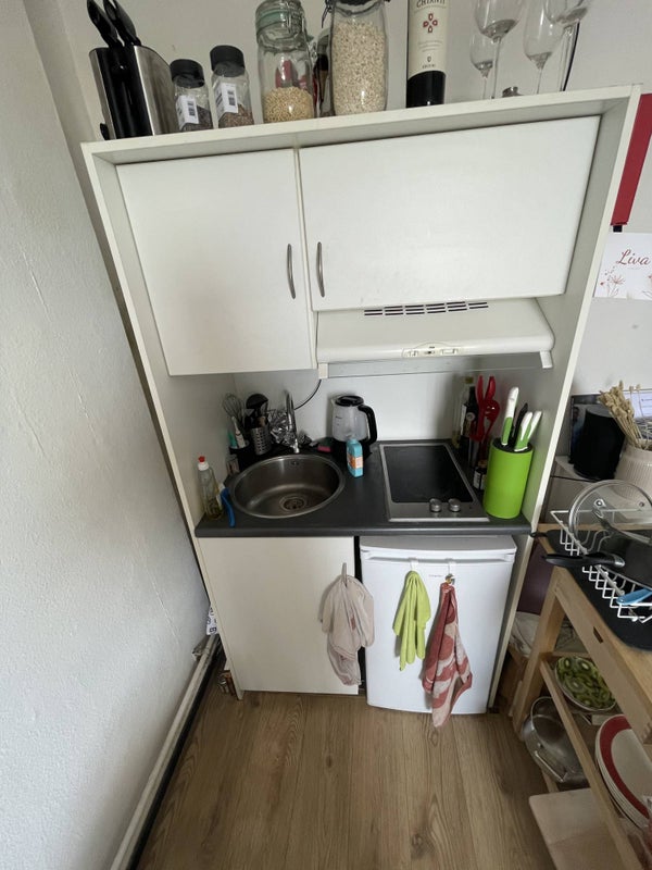 De keuken is uitgerust met een 2 pits elektrische kookplaat, afzuigkap en koelkast.