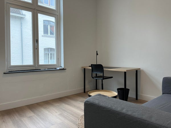 De kamer is gelegen op de eerste verdieping en beschikt over 2 kamers met open verbining. In het voorste gedeelte bevindt zich een kitchenette met 2-pits kookplaat, wasbak, koelkast, afzuigkap en opbergkasten, verder een bank, bijzettafel en een buro met stoel. Het achterste deel is ingericht met een tweepersoonbed incl. matrassen en een kledingkast. De kamer is voorzien van airco, hiermee kan zowel gewarmd als gekoeld worden. De kamers zijn nog niet volledig afgewerkt, dus het uiteindelijke meubilair kan iets afwijken van wat te zien is op de foto's/video.