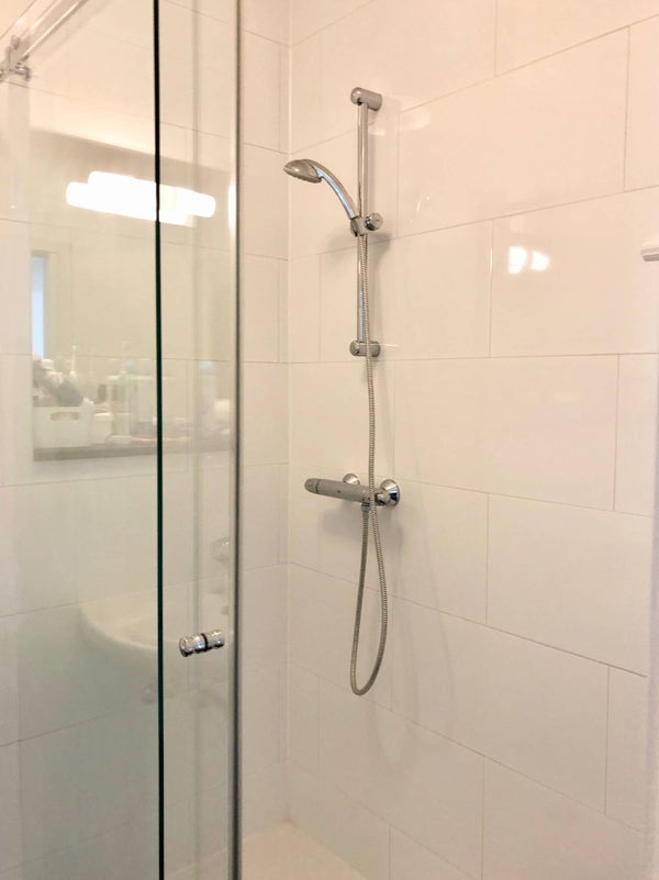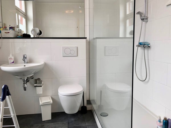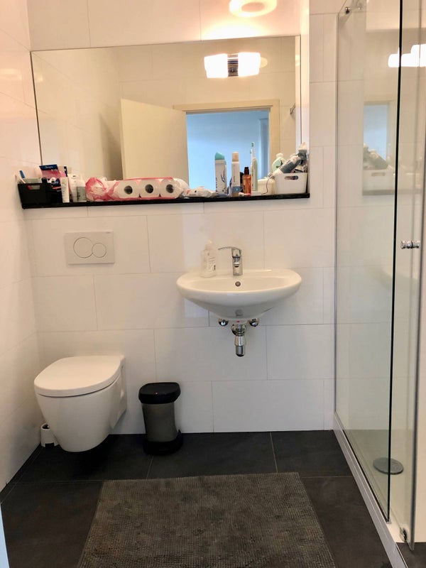 De badkamer (op de tweede verdieping) wordt eveneens gedeeld met één andere kamer en beschikt over een douche, wastafel en toilet.