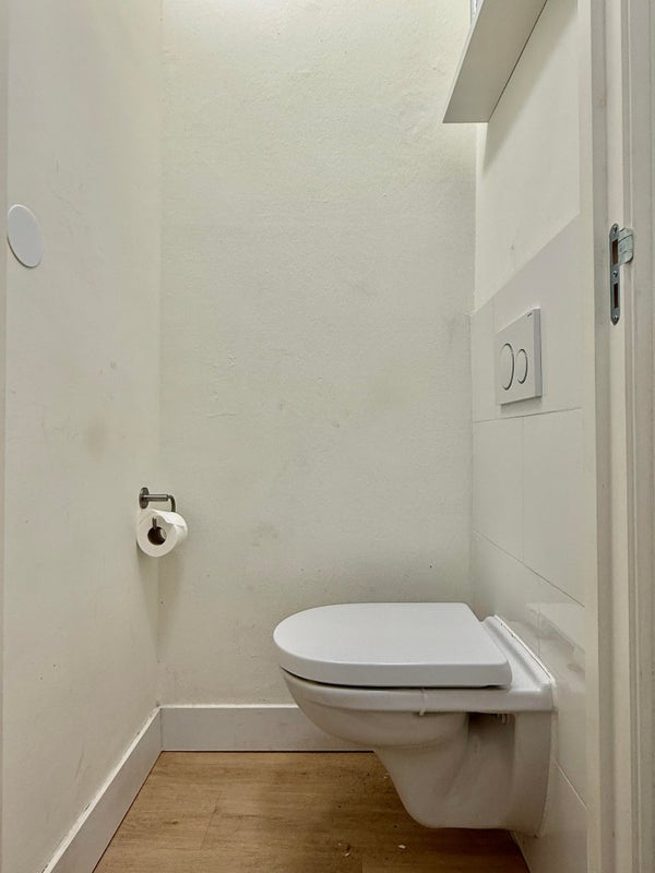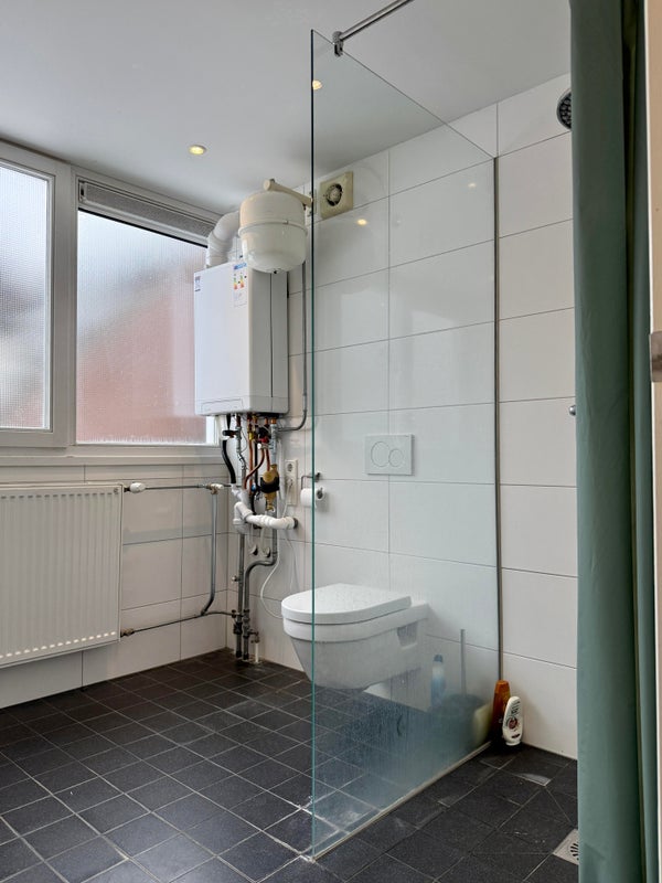 De woning beschikt over een gemeenschappelijke badkamer met douche, toilet en wasmachine, evenals een separaat toilet. Deze voorzieningen worden gedeeld met zes medebewoners.