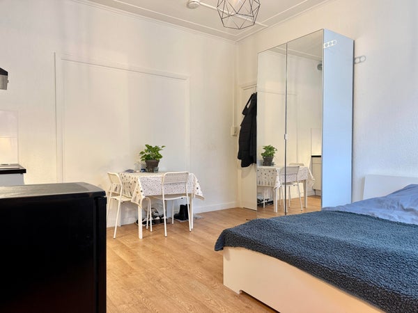 De kamer bevindt zich op de eerste verdieping en is voorzien van grote ramen, wat zorgt voor veel natuurlijke lichtinval. Het keukenblok is uitgerust met een tweepits inductiekookplaat, afzuigkap, spoelbak en voldoende opbergruimte. Daarnaast is er een vrijstaande koelkast met vriesvak inbegrepen.