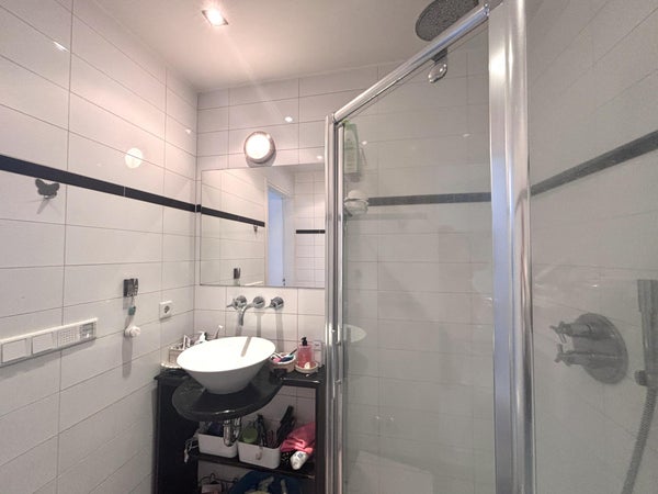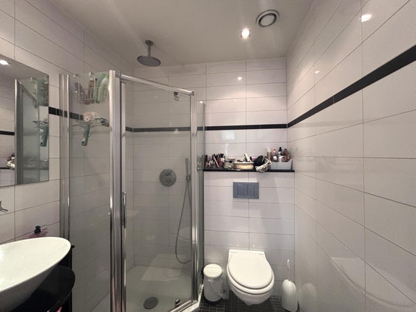 Tweede verdieping: Aan de voorzijde van het pand bevindt zich deze ruime, beschikbare studio. De studio is voorzien van brede raampartijen die zorgen voor een aangename hoeveelheid natuurlijk licht. De stijlvolle badkamer is uitgerust met een comfortabele inloopdouche, een moderne wastafel en een toilet.