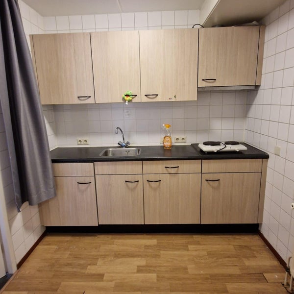 15m2, bed+mattress, bureau+stoel, kast, kledingkast, wastafel, stoffering.