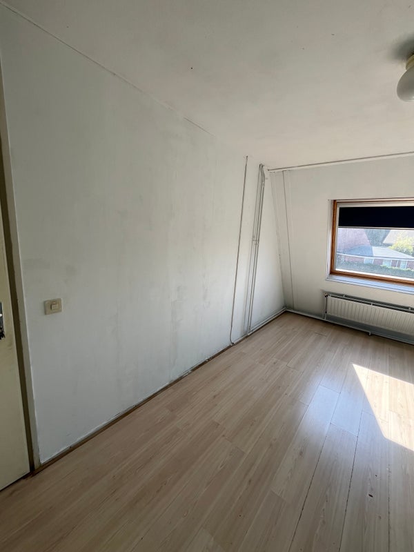 Een lichte kamer met laminaat en een kiepraam