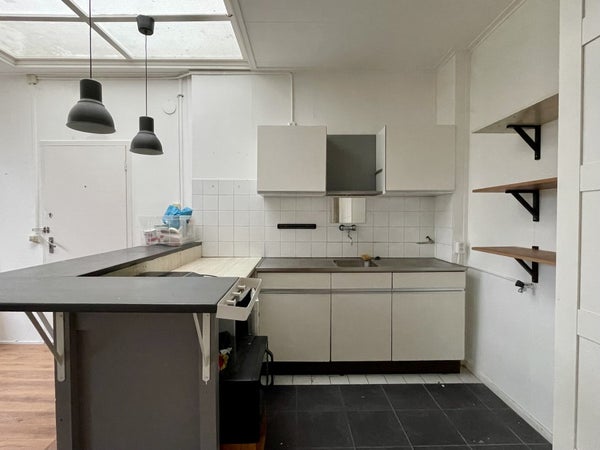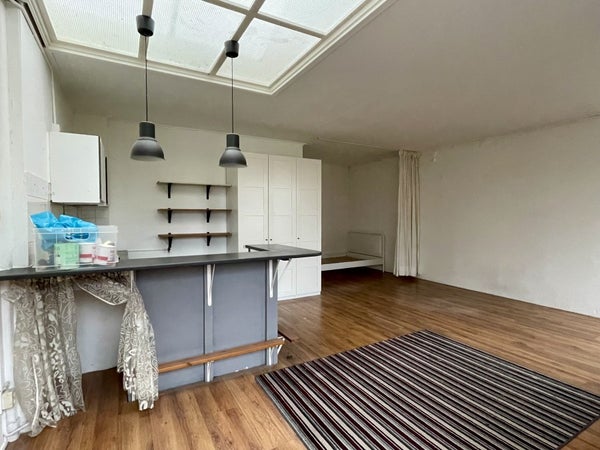 Een ruime en lichte studio met ingebouwde keuken en leuke bar waaraan je kan eten of borrelen. Een gedeelte van de kamer is makkelijk af te schermen, als slaapruimte.