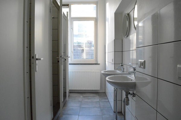 De toiletten, douches, wasmachine en fietsenstalling worden gedeeld met de andere huisgenoten.