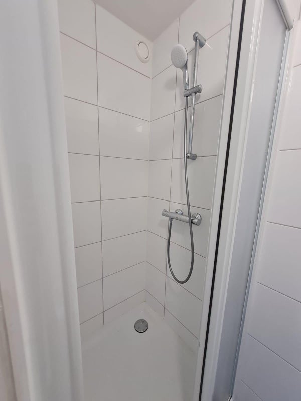 Eigen badkamer met douche en wastafel.