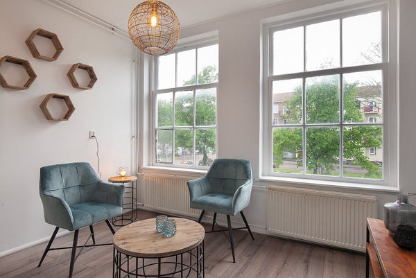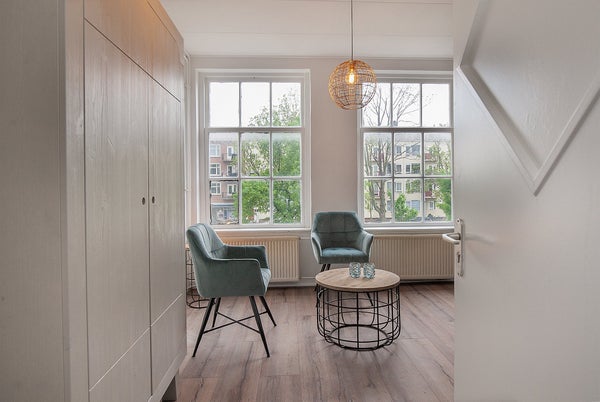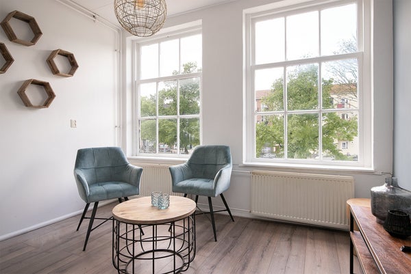 De kamer is gesitueerd aan de voorzijde van de woning met uitzicht op de straat en een groenstrook.