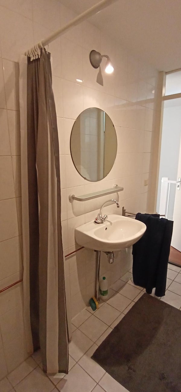 - Luxe badkamer 2.88 x 1.88 geheel licht betegeld, hoekligbad met douche en een wastafel.