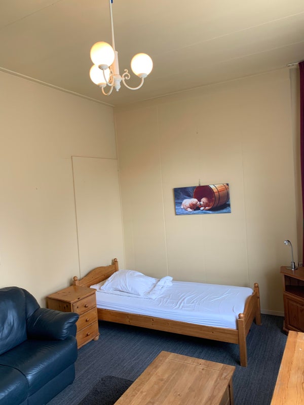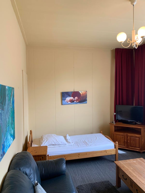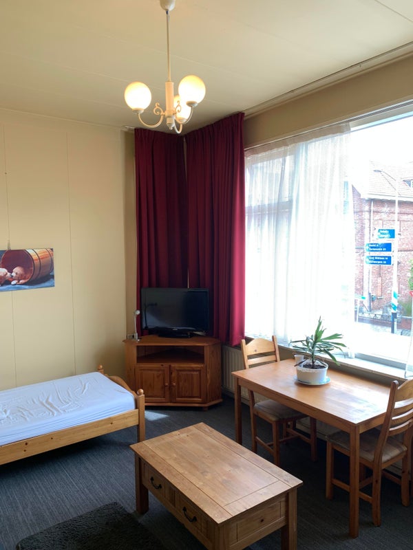 In woon/slaapkamer zijn aanwezig een bankstel, tafel met stoelen, tv met tv-meubel eenpersoonsbed en kledingkast.