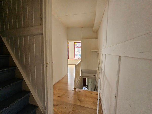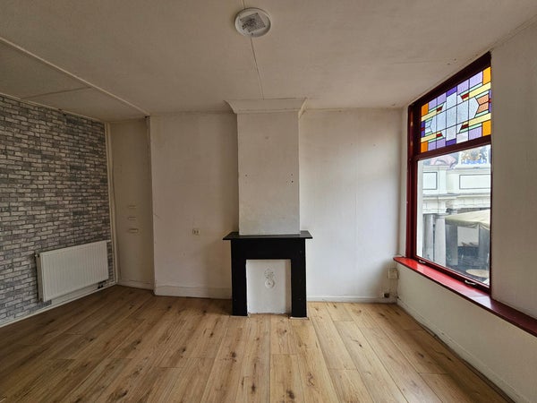 Op de eerste verdieping bevindt zich de woonkamer aan de voorzijde. De ruimte beschikt over twee hoge ramen met glas-in-lood bovenlichten, wat zorgt voor prettige lichtinval. De woonkamer is voorzien van een laminaatvloer en een schouw die het karakter van de woning benadrukt.