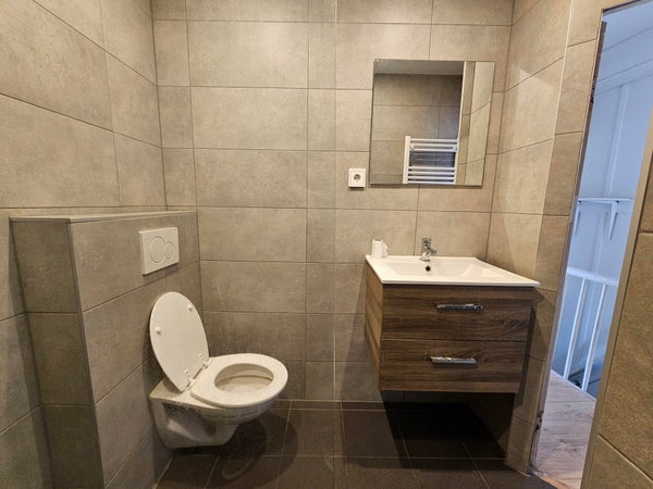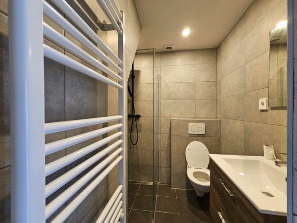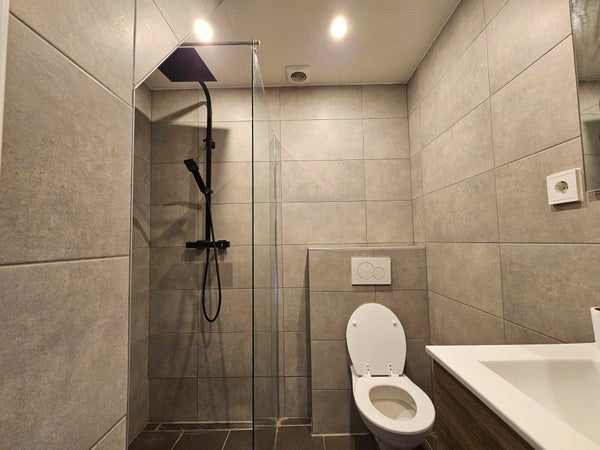 De badkamer is modern afgewerkt met grote wand- en vloertegels en beschikt over een inloopdouche met glazen wand, wastafelmeubel, toilet en handdoekradiator.