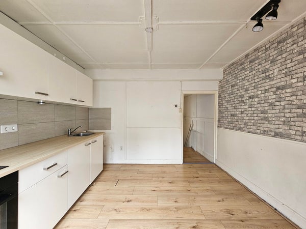 Aan de achterzijde ligt de open keuken. Deze is uitgevoerd in een lichte kleurstelling en voorzien van onder- en bovenkasten, kookplaat, oven, afzuigkap en spoelbak. Vanuit de keuken is er directe toegang tot het dakterras.
