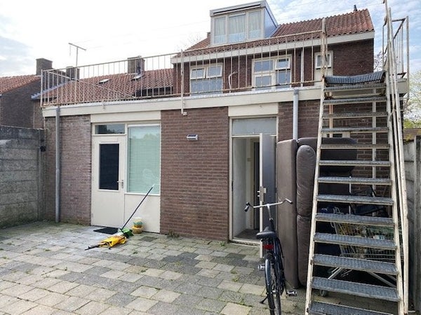 Op de 1e etage is de kamer aan de voorzijde gelegen met een oppervlak van ca. 14 m². Op deze verdieping bevindt zich ook een keuken, toilet en groot dakterras.