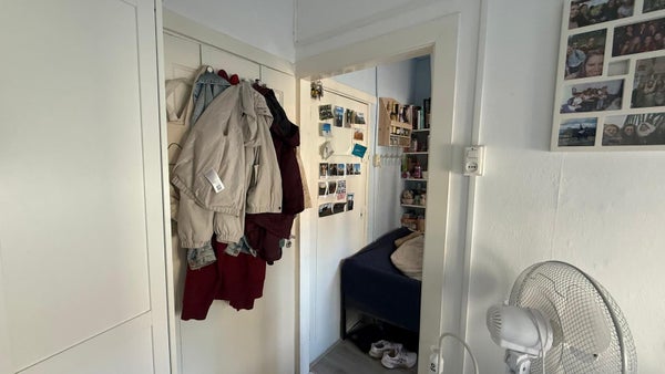 De kamer heeft een goede afmeting en is deels gestoffeerd met een eigen wastafel. De keuken, badkamer en balkon worden gedeeld met drie andere huurders.
