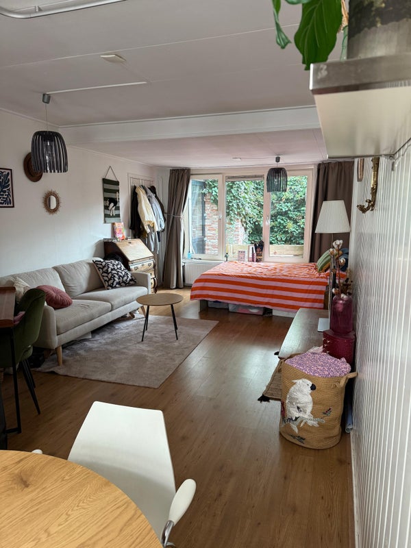 Het betreft een lichte kamer met eigen keukenblokje en toegang tot een eigen tuin.