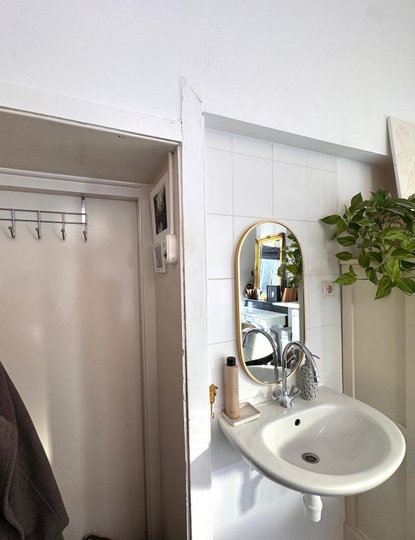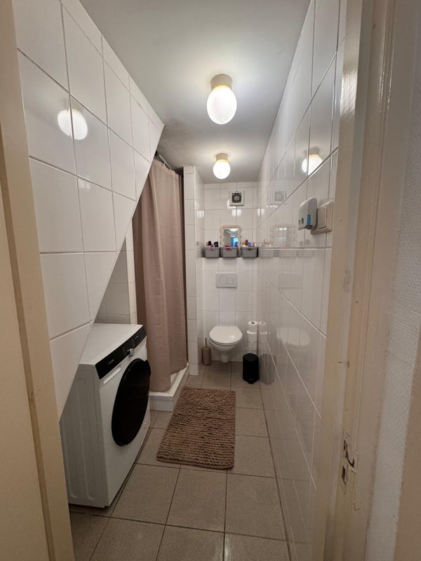 Badkamer met douche, toilet, wastafel en wasmachine-aansluiting worden gedeeld met 2 vrouwelijke huisgenoten.