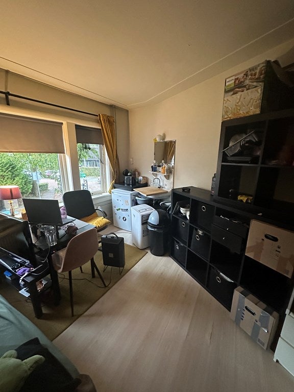 De kamer bevindt zich op de eerste verdieping van het pand en heeft een oppervlakte van circa 16m². De badkamer en de keuken deel je met 5 andere huisgenoten. De badkamer is voorzien van een douche, wastafel en toilet. De gezamenlijke keuken is uitgerust met een afzuigkap en gaskookplaat.