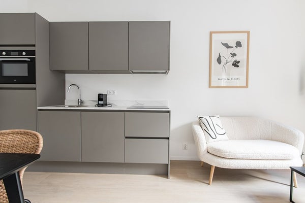 Ideaal voor één of twee bewoners, het appartement beschikt over een mooie open keuken en eetruimte, een comfortabele leef- en werkruimte, en een tweepersoonsbed om te ontspannen aan het einde van een lange dag.