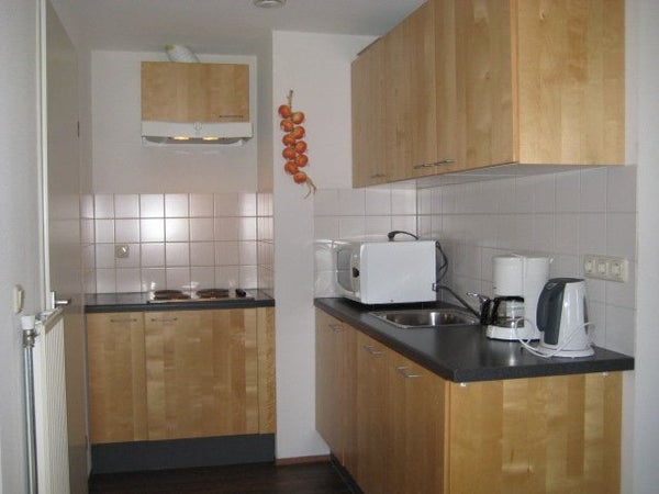 - Open keuken met diverse apparatuur: kookplaat, koelkast, combimagnetron en vaatwasser