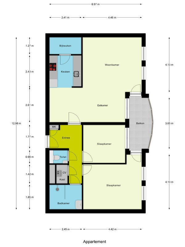 - De galerijflat heeft een woonoppervlakte van 84 m² en beschikt over 3 kamers, waarvan 2 slaapkamers;
