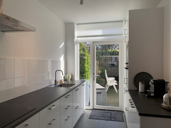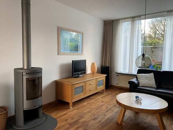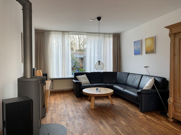 Entree woning, hal, meterkast, toilet (hang) met fonteintje, ruime doorzon woonkamer met sfeervolle houtkachel, luxe keuken met inbouwapparatuur waaronder een vaatwasser, inductiekookplaat, afzuigkap, koelkast, diepvries, heteluchtoven en magnetron