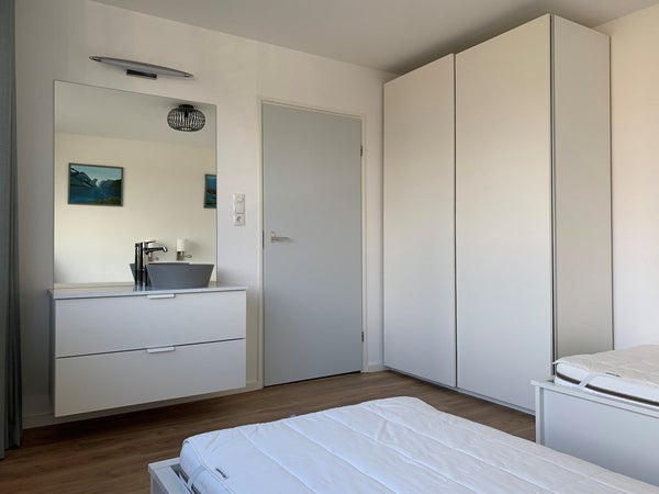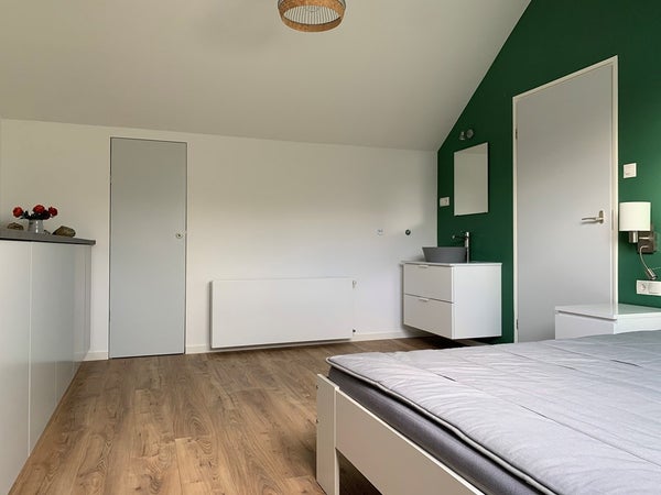 Voorzolder met cv-ketel en witgoedaansluitingen, ruime slaapkamer met wastafelmeubel en kastenwand