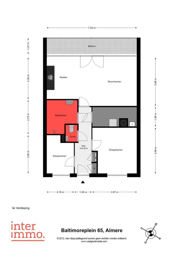 - De galerijflat heeft een woonoppervlakte van 68 m² en beschikt over 3 kamers, waarvan 2 slaapkamers;