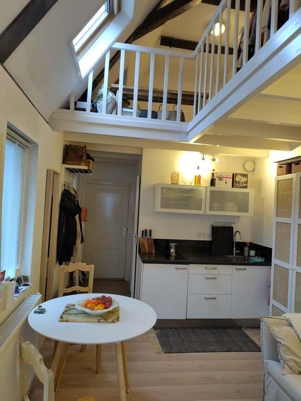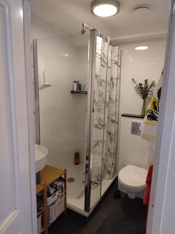 Het appartement zelf is schoon en licht door de lichte kleurstellingen. De badkamer is ruim en voorzien van een douche en toilet. De keuken biedt een koelkast, inductiekoken en een fornuis.