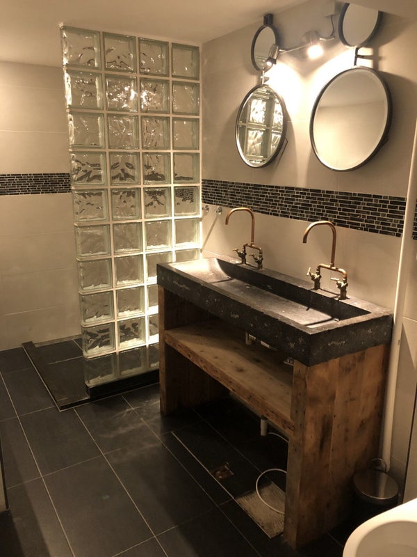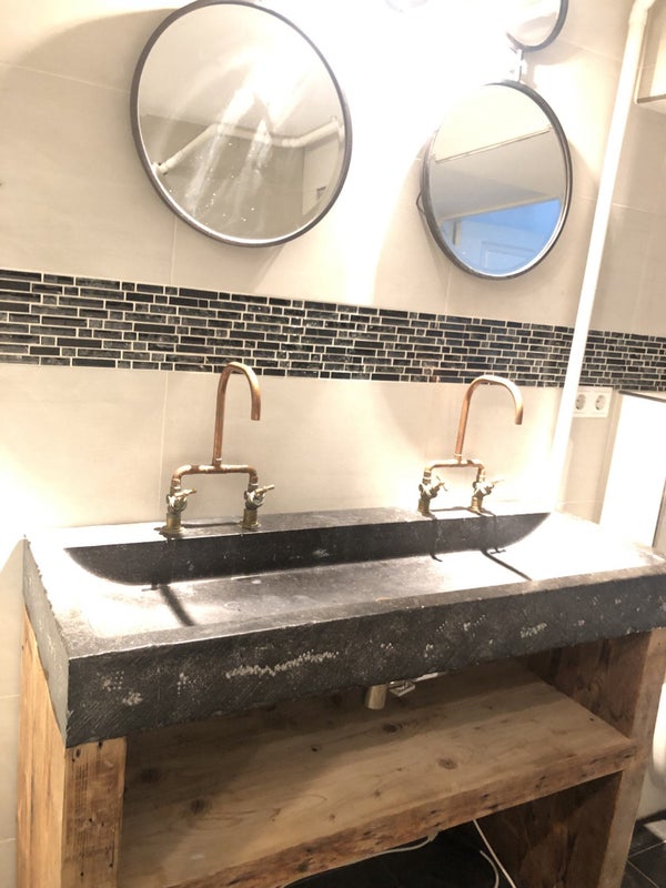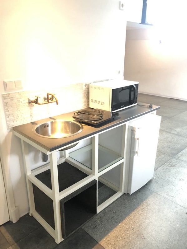 Deze bijzondere studio heeft een modern keukentje en een fraaie badkamer met inloopdouche, ligbad(!), dubbele wastafel en toilet. De keuken is voorzien van een koelkast en kookplaatje.