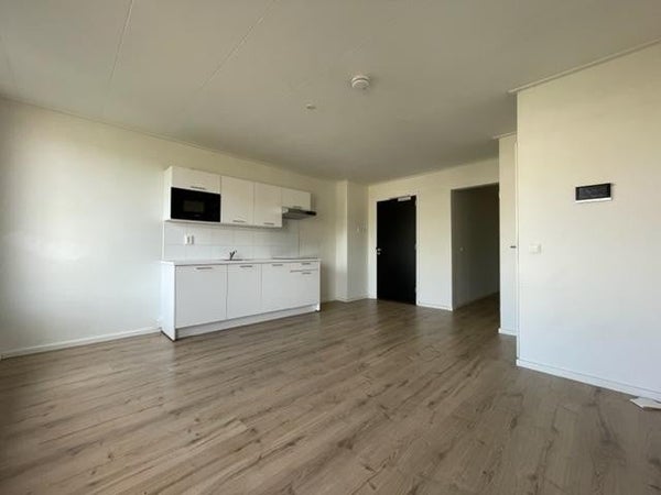 De woonruimte is gesitueerd op de 1e etage aan de zijkant van het complex. Via de gemeenschappelijke hal/entree en het imposante trappenhuis (of middels de lift) is de 1e etage te bereiken. De studio is ca. 32m² groot en bestaat uit een woonkamer met aparte slaapgedeelte, keuken en aparte badkamer. Het geheel is voorzien van nette laminaatvloer en wordt verwarmd middels centrale verwarming. De keuken beschikt over diverse inbouwapparatuur (o.a. koelkast, kookplaat, wasemkap, magnetron) en voldoende opbergruimte. De badkamer is voorzien van zwevend toilet, wastafel en douchecabine. In de kelder van het complex is een aparte wasruimte ingericht voorzien van meerdere wasmachines en drogers. Tevens is hier een fietsenstalling aanwezig.